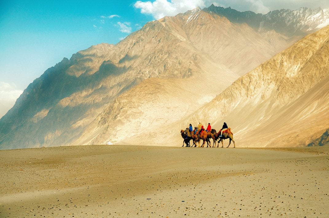 Beyond Diskit, the road leads to a small desert with rolling sand dunes known as Hunder Sand Dunes. This area is home to double-humped Bactrian camels which were brought from the Gobi desert in Mongolia when Hunder was a stopping point for caravans travelling on the ancient Silk Road between Xinjiang and India. The small village of Hunder, with little bit more than 1,000 inhabitants, offers several accommodation options..