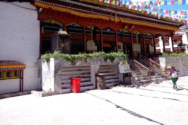 TThis temple was built in the middle of the last century, it is located next to the Main Bazar in a large and peaceful courtyard. It is accessed through a small gate just opposite of the State Bank of India building. Gompa Soma has a golden triple roof strung with hundreds of prayer flags and it houses several finely decorated statues. There are dozens of prayers wheels all around the building as well as a large prayer wheel in a room on the right side. The Ladakh Buddhist Association headquarters are also located within this complex.
