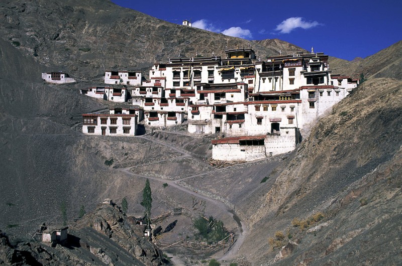 Thiksey Monastery, 20 kilometres east of Leh, is one of the largest and most impressive gompas in Ladakh. Its architecture reminds of the Potala Palace in Lhasa, Tibet. The monastery belongs to the Gelugpa order, approximately 80 monks live in the whitewashed huts on the lower part of the hill, the prayer halls and temples are located at the top. The monastery complex has many temples and shrining rooms including a prayer chamber containing a fascinating 14-metre-high statue of Maitreya (the future Buddha) in a finely-decorated headdress.
